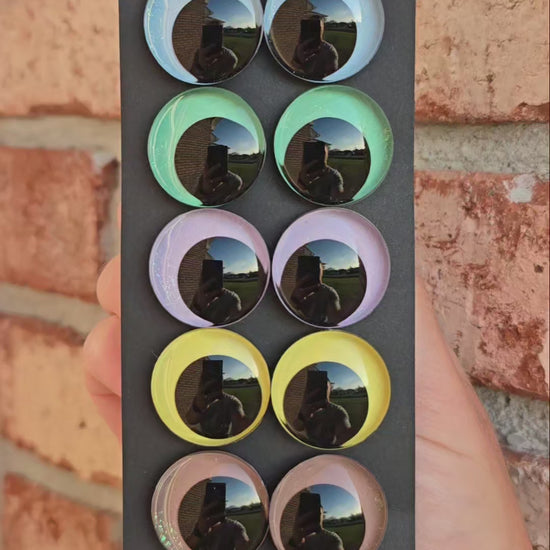 Each eye set is handpainted to order. Your order will be shipped within a week. Please allow more time for larger orders. Colors can be hard to photograph and may vary slightly depending on your screen. I do my best to take pictures in bright lights to show the actual color.